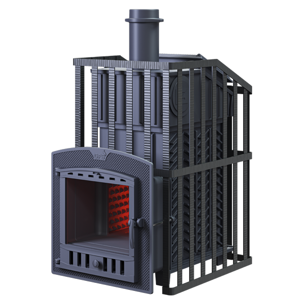 GFS-ЗК в сетке 40 (П2) Ураган - расширенный комплект печи GFS-ЗК в сетке. Максимально приближенный вариант печи для режимов русской парной, имеющий непосредственно закрытую чугунным коробом каменку, дверцу для пара с ручкой из бука, увеличенную до 50см чугунную стартовую трубу. Печь легко модернизируется до полноценной печи предназначенной для Русской бани путем замены стальной сетки на каменную облицовку без демонтажа дымохода.